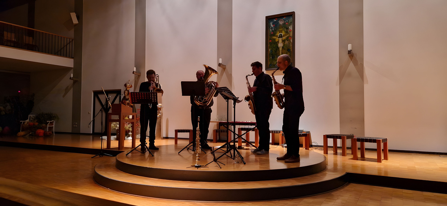 Wieder eine Uraufführung bei den Altacher Soireen: Diesmal ohne dass es jemand wusste außer den Musikern. Beim mitreißenden Konzert am 21. Oktober im Pfarrzentrum spielte die Formation Mixed Horns (die Saxophonisten Martin Franz und Klaus Peter, Phil Yaeger als Posaunist und Thomas Halfer, Tuba) das Stück “Godspeed, Gentle Giant” (soviel wie 'Alles Gute, lieber Riese, möge Gott dich leiten / voranbringen'). Zusammen mit dem Pop-, Rock-, Jazz- und Elektronik-Musiker Benny Omerzell, der es für diesen zweiten Auftritt mit den vier Bläsern komponiert hat. Ein eindringliches Adieu, Herzschlagmusik am Keyboard und dazu die Fülle, die Blasinstrumente zu Gehör bringen können, Trauer und Segen, Abschied und Hoffnung.