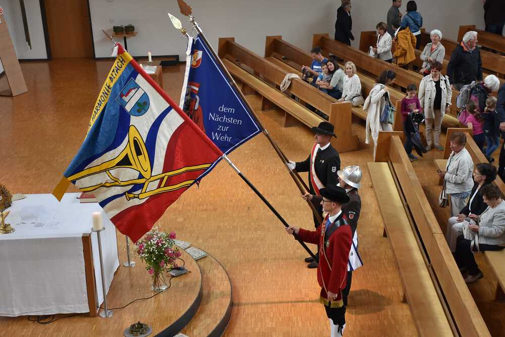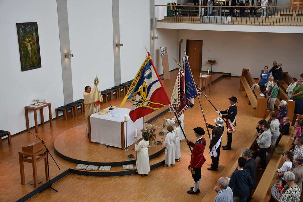 „Die Himmel rühmen des Ewigen Ehre“ – dieses bekannte Lied von Ludwig v. Beethoven sang der Kirchenchor am Beginn des Fronleichnams-Festgottesdienstes, der auf Grund der schlechten Witterung in der Kirche stattfand. Abordnungen des Kameradschaftsbundes, der Freiwilligen Feuerwehr und der Harmoniemusik Altach haben sich zusammen mit zahlreichen Gläubigen eingefunden, um diesen Festtag würdig zu begehen.