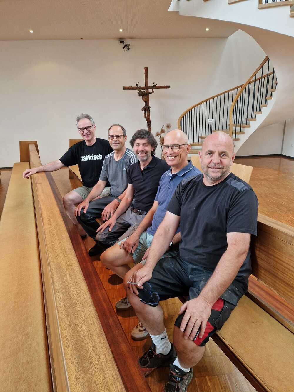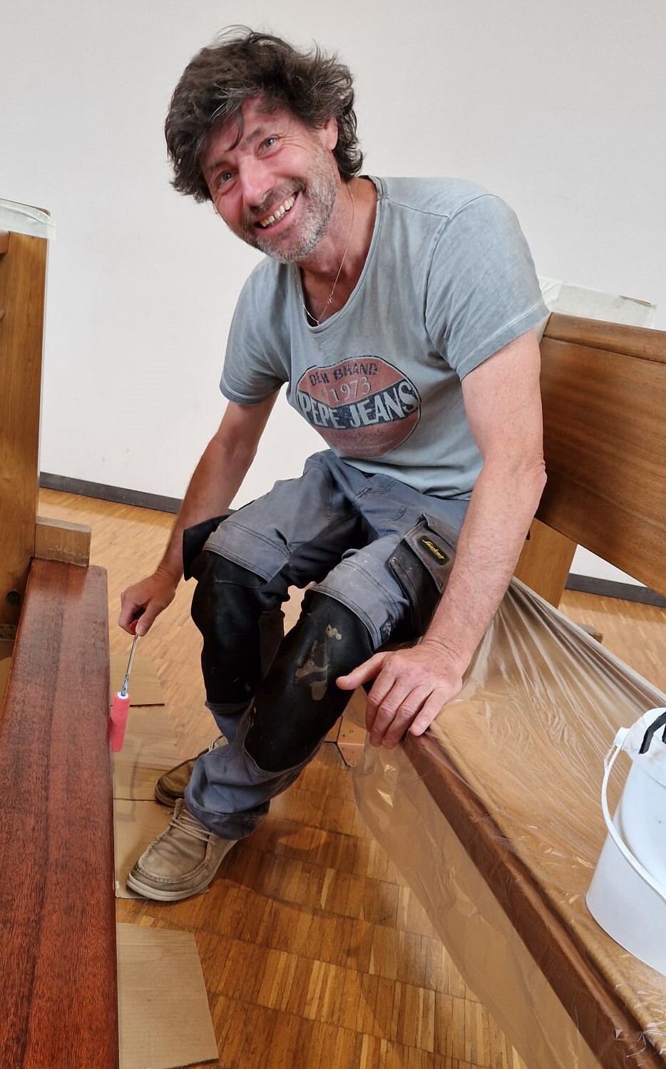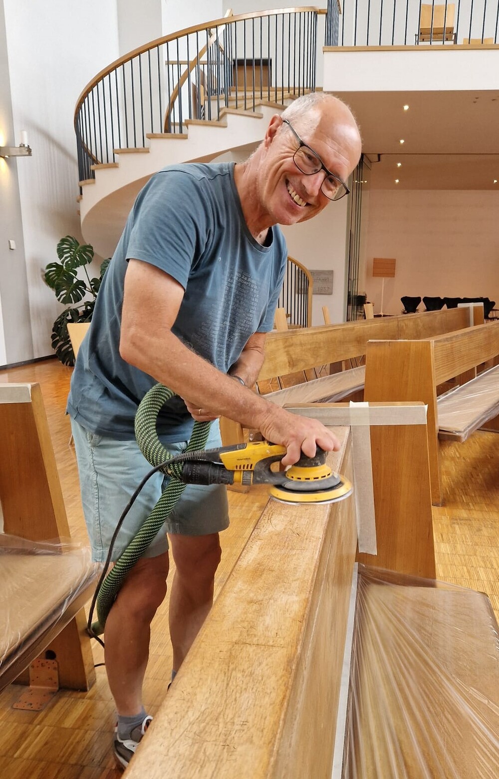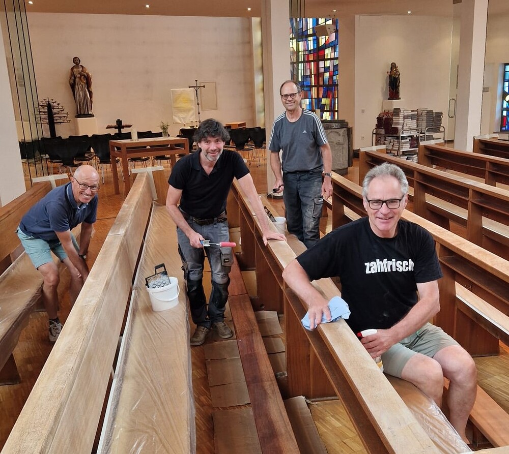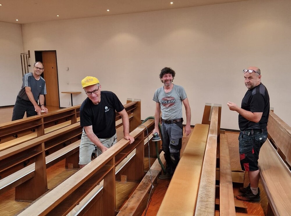 Wer will fleißige Handwerker sehen! Dank der fleißigen Hände unserer Helfer haben die Kirchenbänke eine noble Restaurierung erhalten.