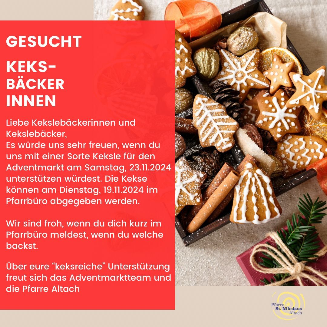 Die Kekse können am Dienstag, 19.11.2024 im Pfarrbüro abgegeben werden. Wir sind froh, wenn du dich kurz im Pfarrbüro meldest, wenn du welche backst (05576 42010 oder pfarrzentrum@pfarre-altach.at).