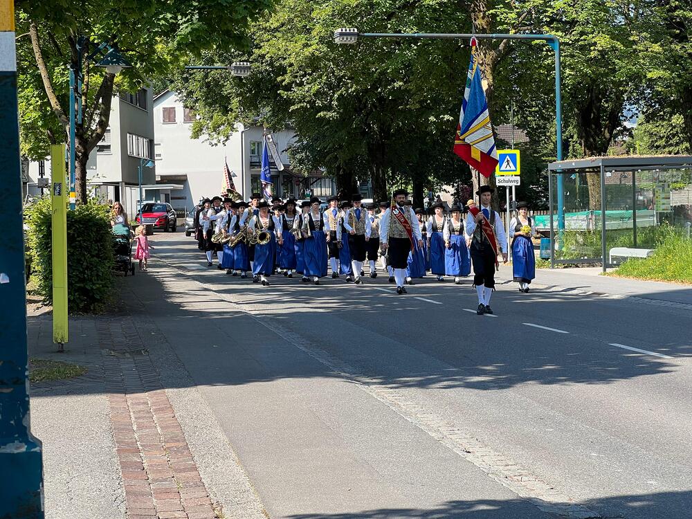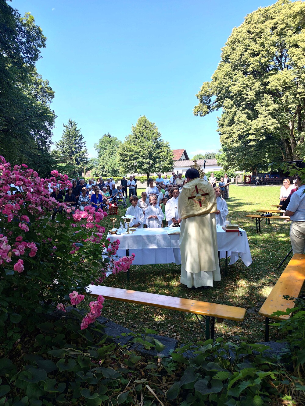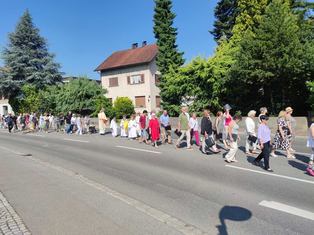 In der traditionellen Fronleichnams-Prozession werden Monstranz und Hostie durch die Straßen getragen. Diese führte heuer von der Pfarrkirche über Rheinstraße, Mühlbachstraße, Alteichweg und Schulstraße. Vor zahlreichen Häusern auf dem Weg waren wundervoll geschmückte Altäre mit Blumen, Kreuzen und Kerzen aufgebaut.