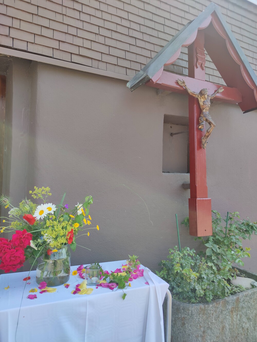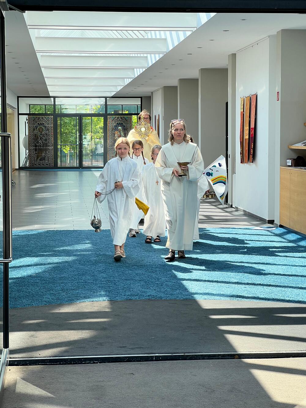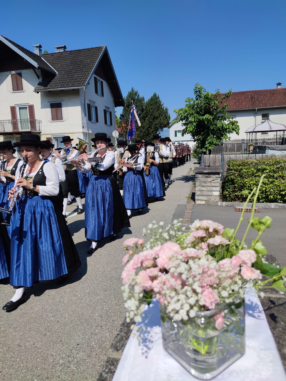 In der traditionellen Fronleichnams-Prozession werden Monstranz und Hostie durch die Straßen getragen. Diese führte heuer von der Pfarrkirche über Rheinstraße, Mühlbachstraße, Alteichweg und Schulstraße. Vor zahlreichen Häusern auf dem Weg waren wundervoll geschmückte Altäre mit Blumen, Kreuzen und Kerzen aufgebaut.