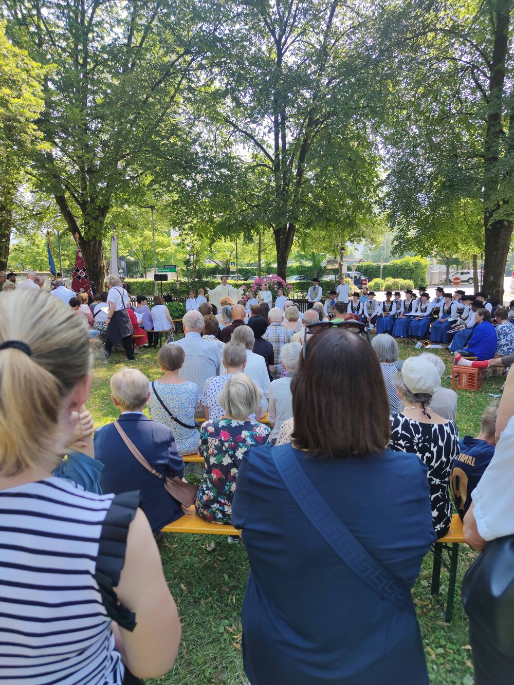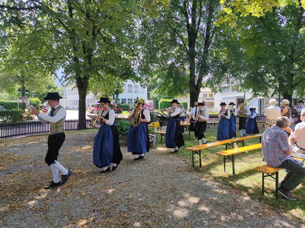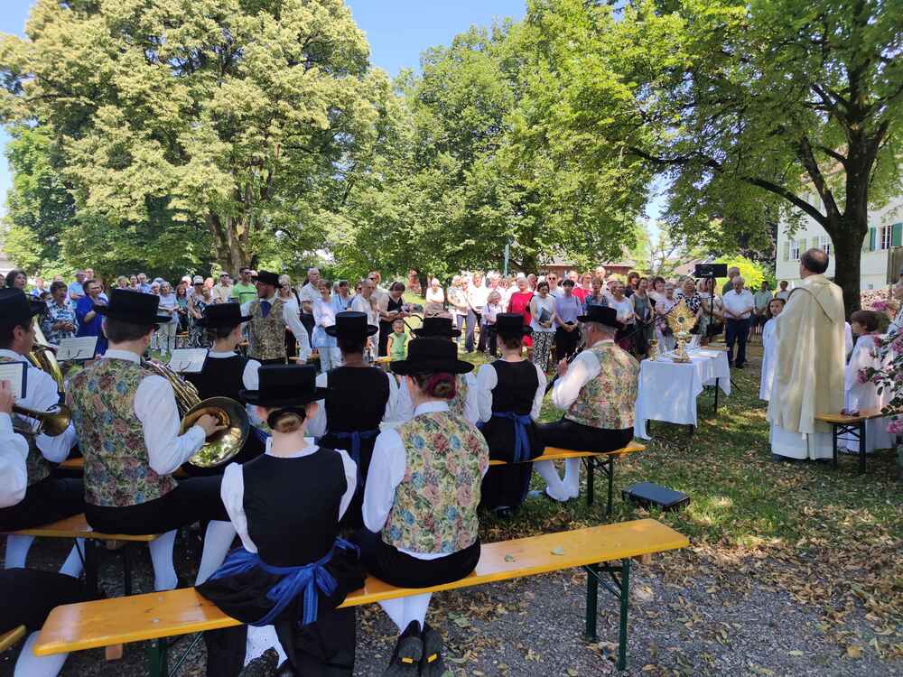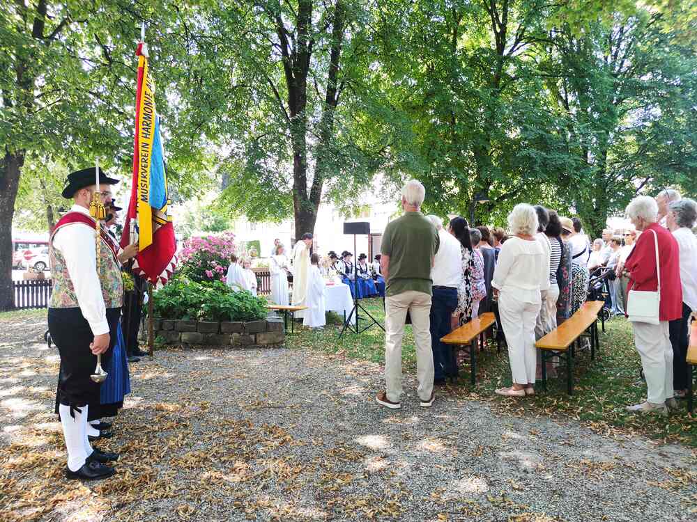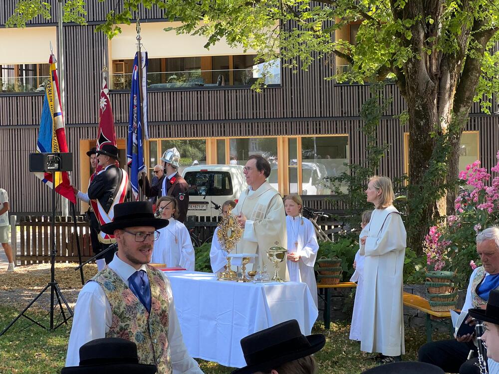 Ziel der Prozession war der Dorfplatz, wo im herrlichen Schatten der Bäume der Gottesdienst im Freien gefeiert wurde. Auch einige Bewohner/innen des Pauli-Hauses gesellten sich dazu. Musikalisch begleitet wurde die Messe vom Pfarrkirchenchor und vom Musikverein Harmonie, der auch bereits die Prozession gemeinsam mit der Feuerwehr angeführt hatte.