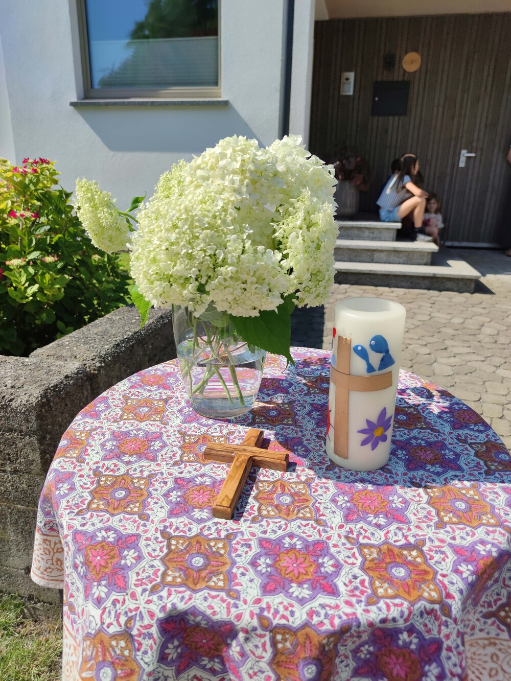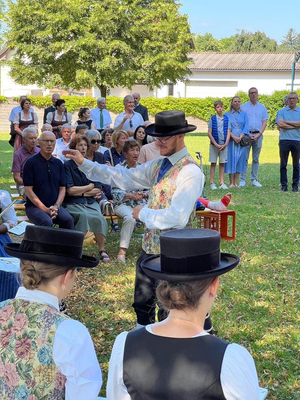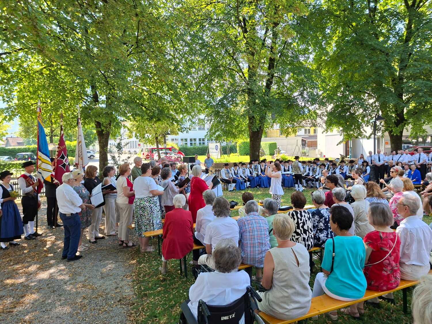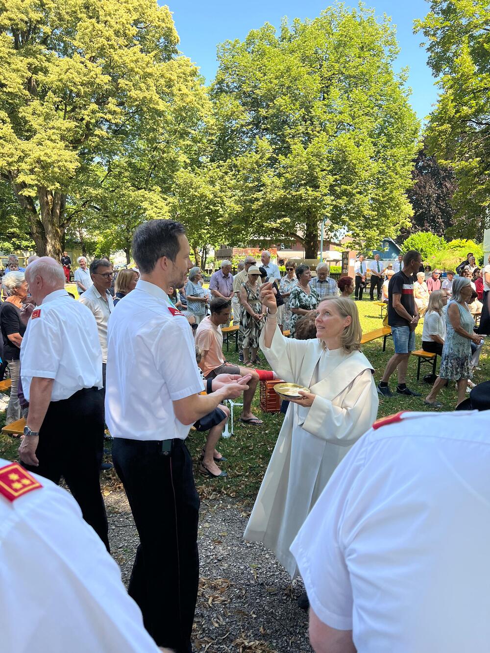 Ziel der Prozession war der Dorfplatz, wo im herrlichen Schatten der Bäume der Gottesdienst im Freien gefeiert wurde. Auch einige Bewohner/innen des Pauli-Hauses gesellten sich dazu. Musikalisch begleitet wurde die Messe vom Pfarrkirchenchor und vom Musikverein Harmonie, der auch bereits die Prozession gemeinsam mit der Feuerwehr angeführt hatte.