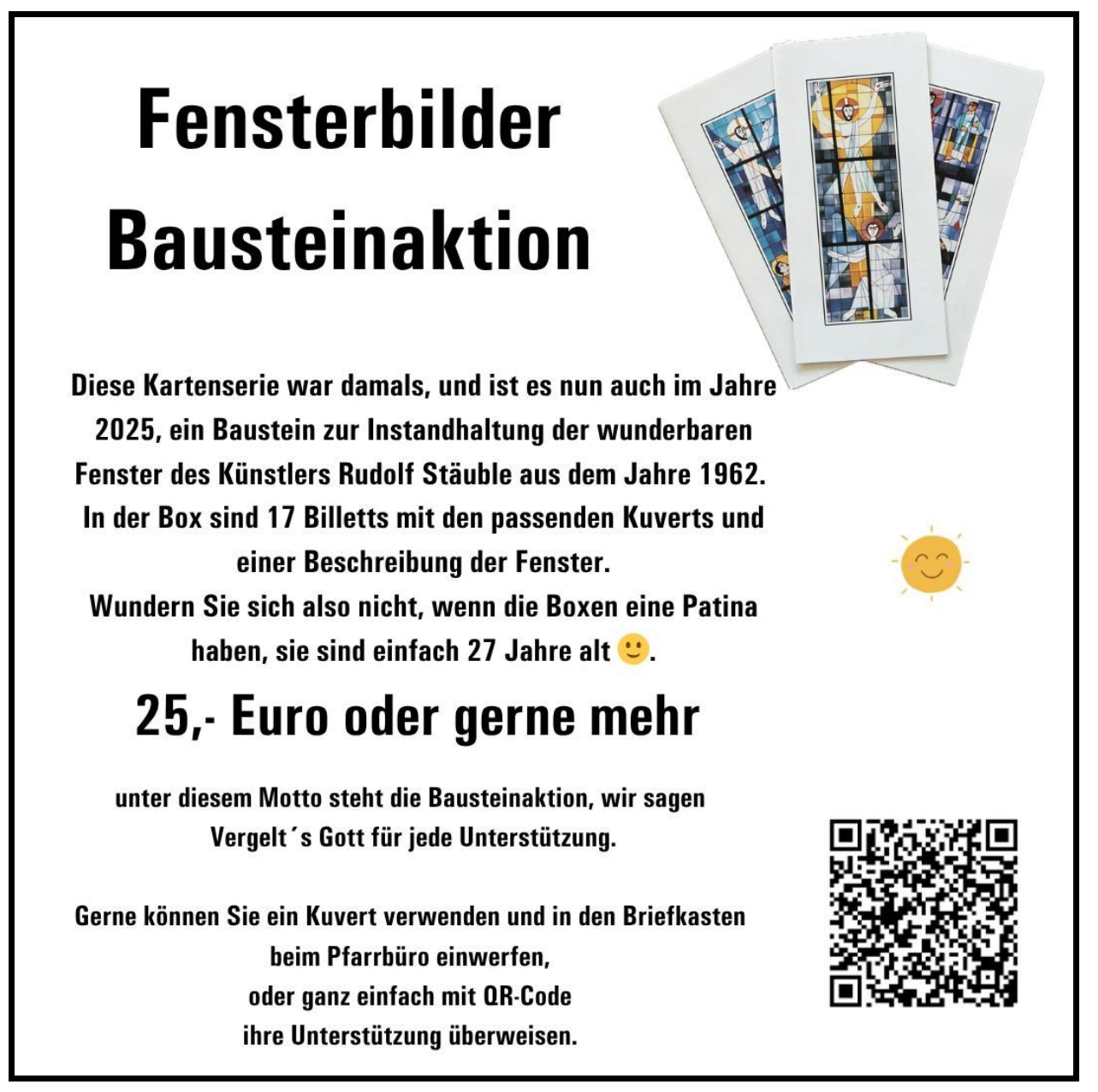 Beim Gottesdienst an „Peter und Paul“ am 29. Juni werden wir informieren und bitten um Unterstützung dieser Maßnahmen. Mit einer Patenschaft für unsere liebevoll gestalteten und aufgewerteten Fensterbilder unterstützen Sie die kreative Arbeit und bringen auch Freude und Farbe in unseren Alltag. Ihre Patenschaft sorgt für ein besseres Raumklima.