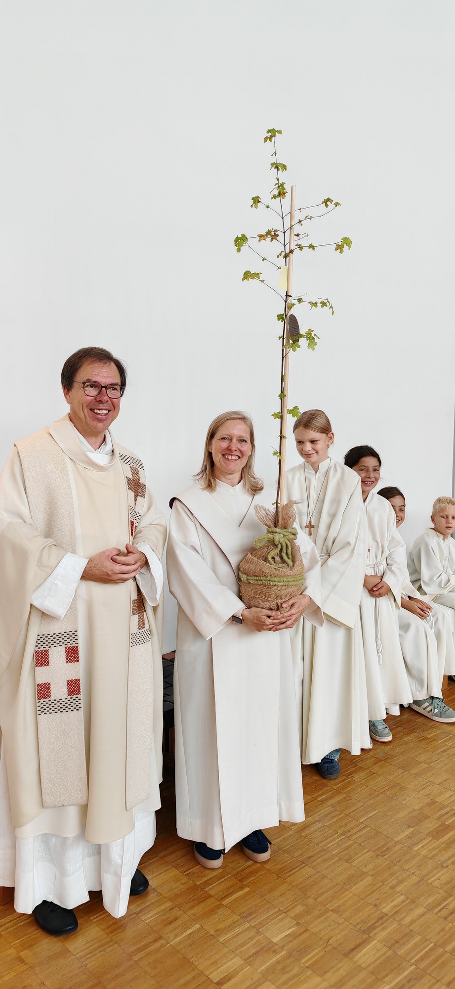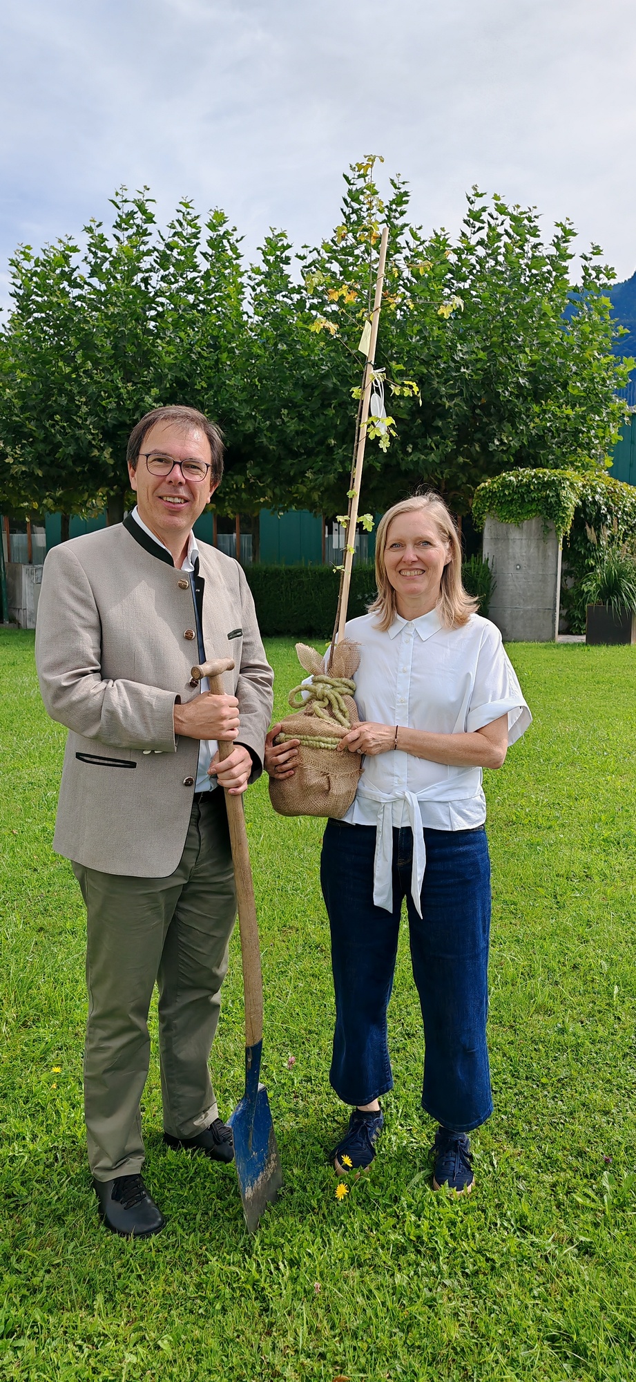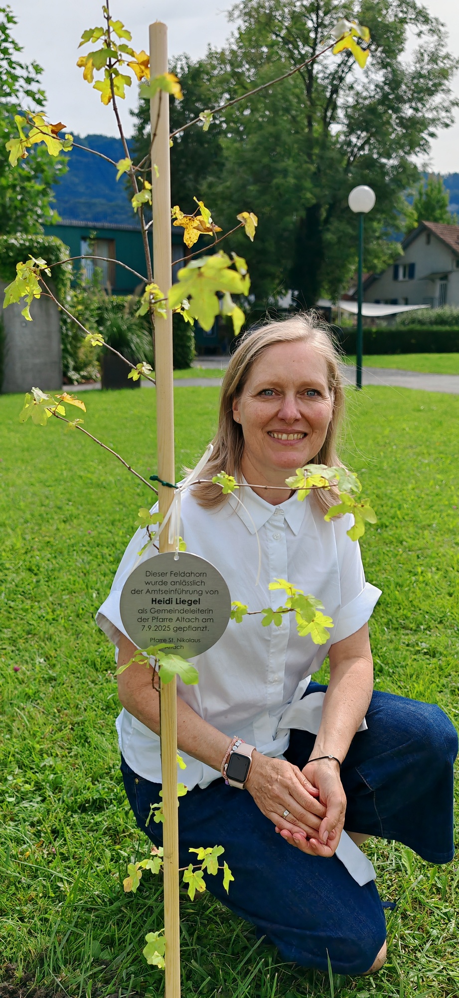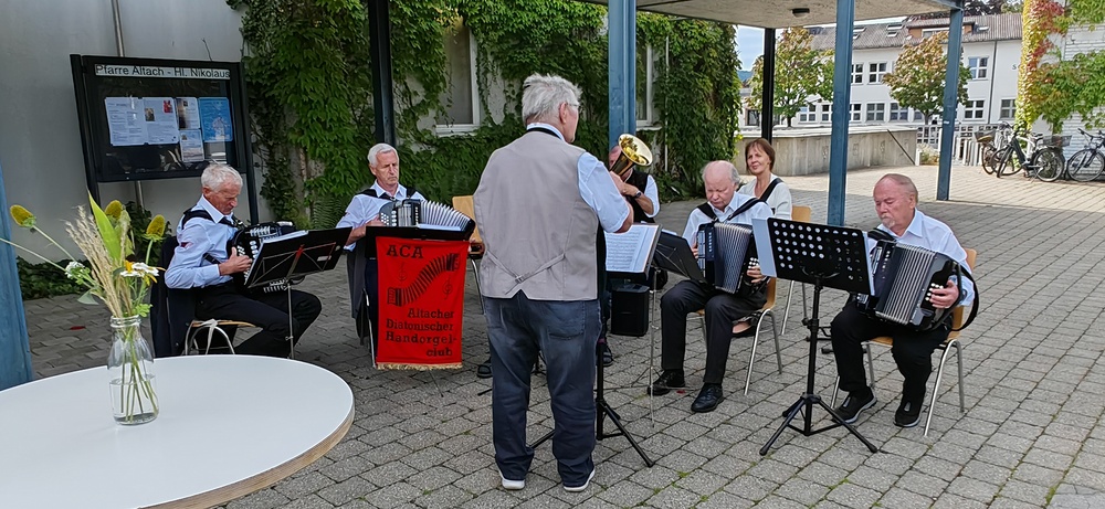 Im Anschluss lud die Pfarre zum gemütlichen Ausklang bei einer Agape Deluxe auf den Kirchplatz ein, die von der Diatonischen Gruppe des Akkordeonclubs Altach begleitet wurde. Die frisch gebackene Gemeindeleiterin durfte dabei zahlreiche Glückwünsche entgegennehmen. Als lebendiges Symbol für Hoffnung, Neubeginn und Zusammenhalt in unserer Pfarre pflanzte Heidi mit Unterstützung von Pfarrer Rainer einen kleinen Feldahorn auf dem Kirchengelände. In einer Zeit voller Herausforderungen soll damit ein Zeichen für unsere Umwelt, für kommende Generationen und für das Vertrauen in eine gute Zukunft gesetzt werden.